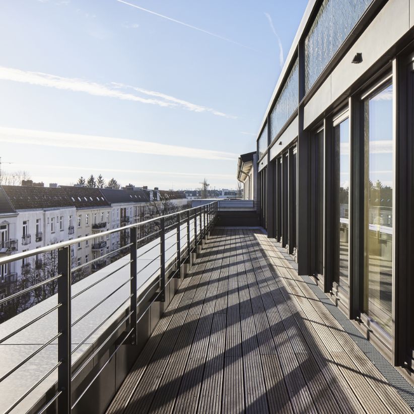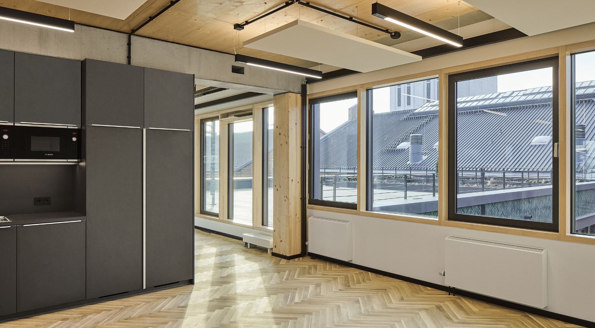 Unter allen faszinierenden Details im Timber Office wird eines alle Blicke auf sich ziehen: die elegante Fichtenholzdecke, die in Verbindung mit der natürlichen Sonneneinstrahlung ein durchweg außergewöhnliches Flair erzeugt. Dennoch hat jede Etage eine eigenständige, sehr flexible Struktur mit individuellem Charakter.